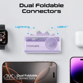 Promate raises the bar for compact portable power with the all-new PowerUp-Trio 5000mAh Mini Power Bank. Seamlessly integrating cutting-edge technology into a compact design, this pocket-sized powerhouse features a trio of charging options including a 20W USB-C™ In/Out foldable connector, 12W Lightning output foldable connector, plus a dedicated 2.5W Apple Watch charger on the front. Engineered for safety and reliability, it includes over-charging and over-heating protection. Its sleek metal kickstand doubles as a sturdy support for hands-free viewing. With a portable, mini form factor, versatile charging options and an intuitive LED display for battery monitoring, the Promate Mini Power Bank is your ultimate companion for staying charged, connected, and in control wherever you go.
