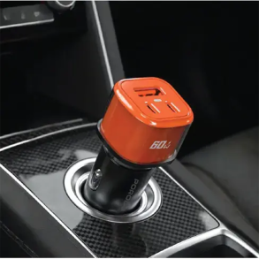 The Porodo 60W Averin Multi-Port Car Charger with Aluminum Alloy Housing - Orange is an incredible item for fast and effective charging during travels. Its total output of 60W makes it possible to quicken the process for multiple devices simultaneously, and you can charge your smartphone, tablet, and other devices without any delay. The USB-A output is 18W QC, and the two USB-C outputs have PD 30W, and they are also very fast. The charger made of aluminum alloy and PC material is not only a beautiful and compact device but also very reliable because it has a lifespan that is in line with heavy usage. The DC 12-24V input lets you use it in a huge range of cars. Its compatibility is so great that most devices won't give you any hard time at all. Hence, be it a phone, a laptop, or a tablet, the Porodo 60W Averin Charger will not only grant you efficient and high-speed charging but will also equip you with top safety features, thus making it a car essential item.