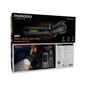 The Porodo Lifestyle Orbit Multi-Color Laser Torch with Power Bank Function is a multifunctional tool that not only illuminates powerfully but also serves as a power bank. The torch is made of aluminum alloy and ABS and has a black finish. It has a modern look. The torch produces light from 38LM up to 300LM to make it adaptable to any situation. The laser torch is available in four colors, namely, white, blue, yellow, and red, and has a 200-meter range, allowing the user to have visibility and selectivity when needed. The torch's main light of a 5000mAh battery, giving 8 hours of run time, while the side light can last for 20 hours at max. It's very easy to use the 360° rotation and zoom focus for you to set the beam as per your requirement. For quick and hassle-free recharge, the Type-C charging port is provided. Regardless of work, outdoor activities, or a power bank desktop, the Porodo Lifestyle Orbit Laser Torch is an amazing tool for every adventurer or DIY enthusiast.